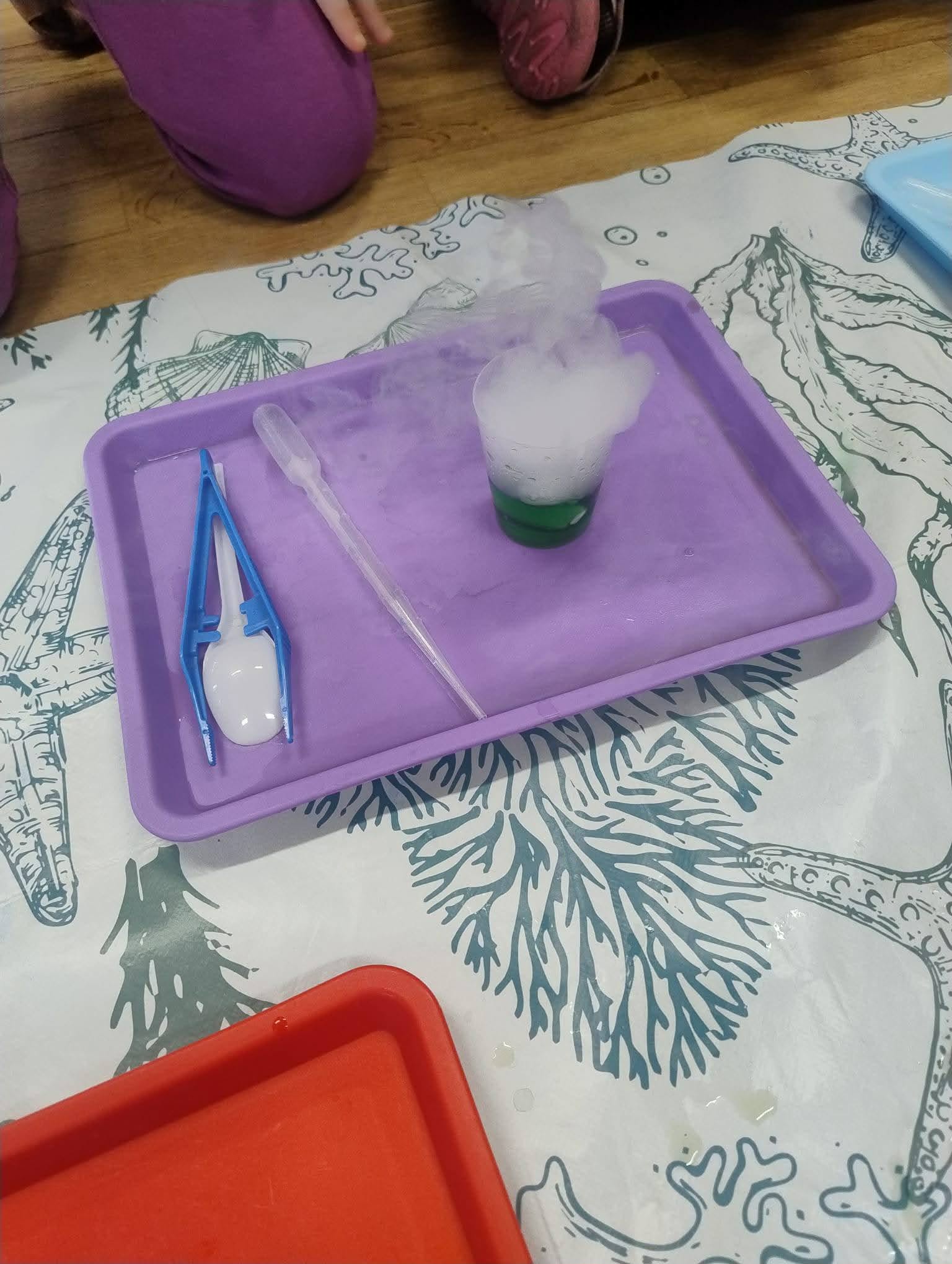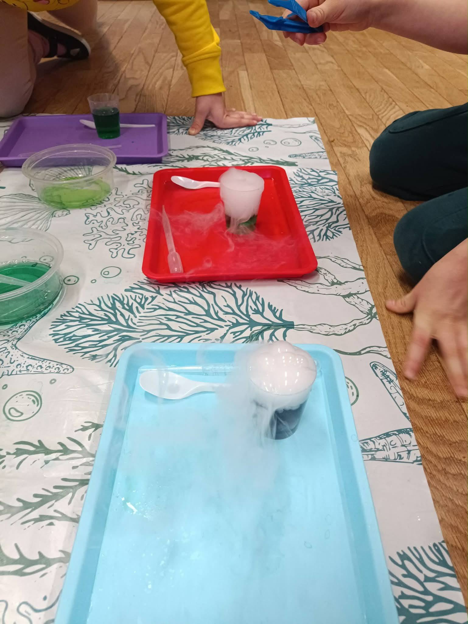 Podczas zajęć nasze przedszkolaki dowiedziały się, czym jest suchy lód i jak działa, stworzyły tajemnicze mgły,