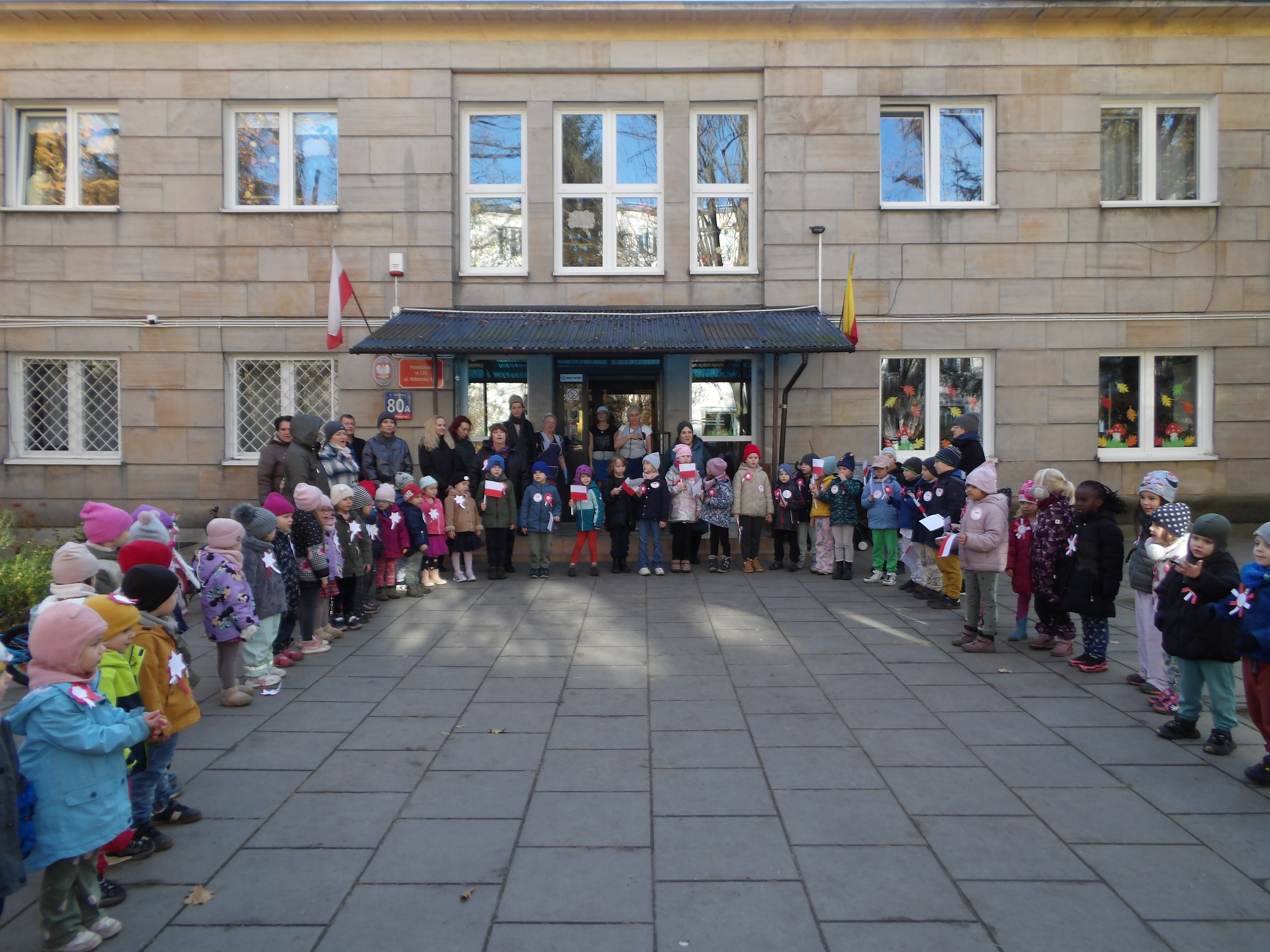 W tym roku podobnie jak w ubiegłym roku spotkaliśmy się wszyscy przed Przedszkolem. Do dzieci dołączyli pracownicy Przedszkola. I wspólnie odśpiewaliśmy Hymn Polski.