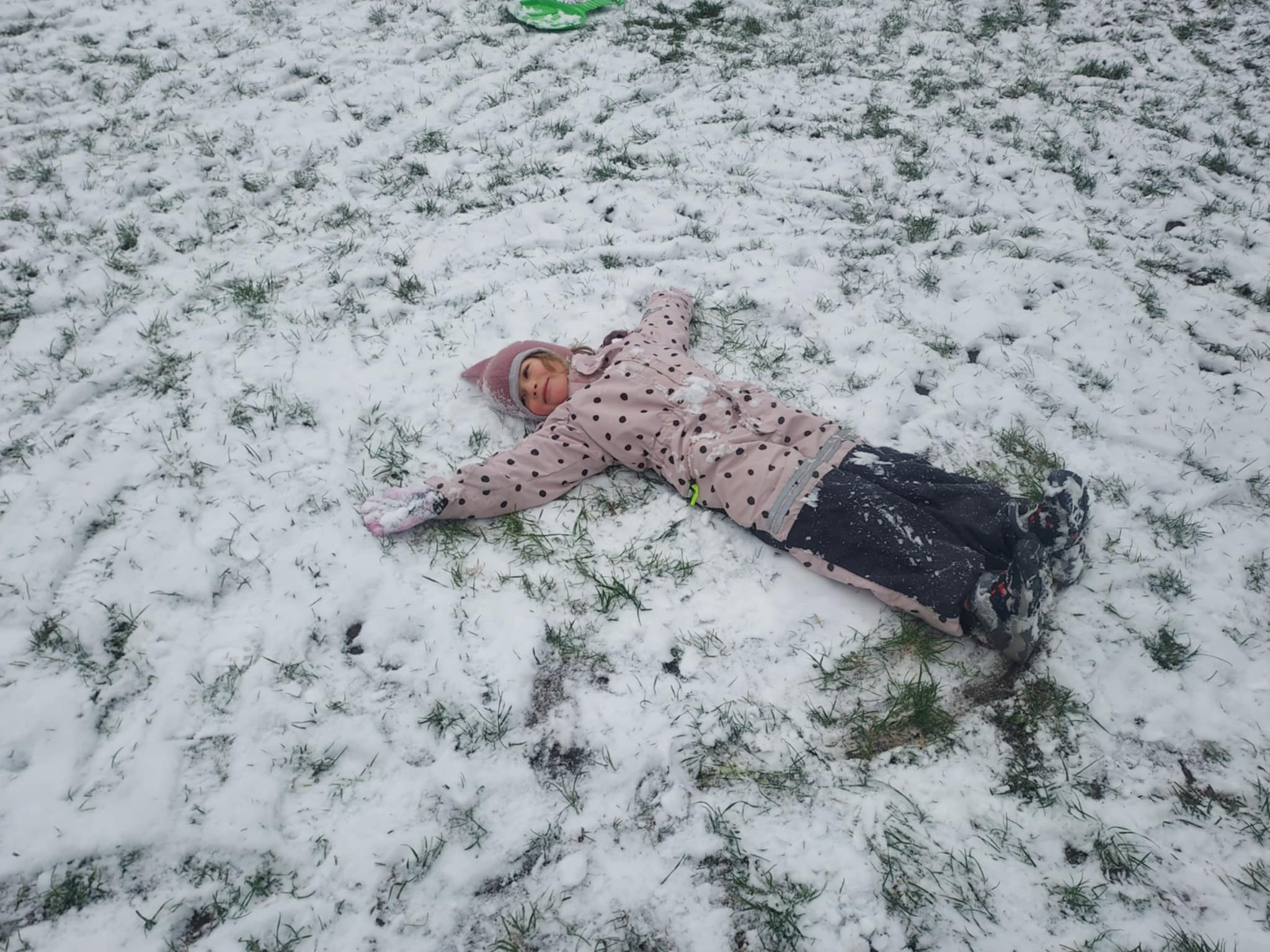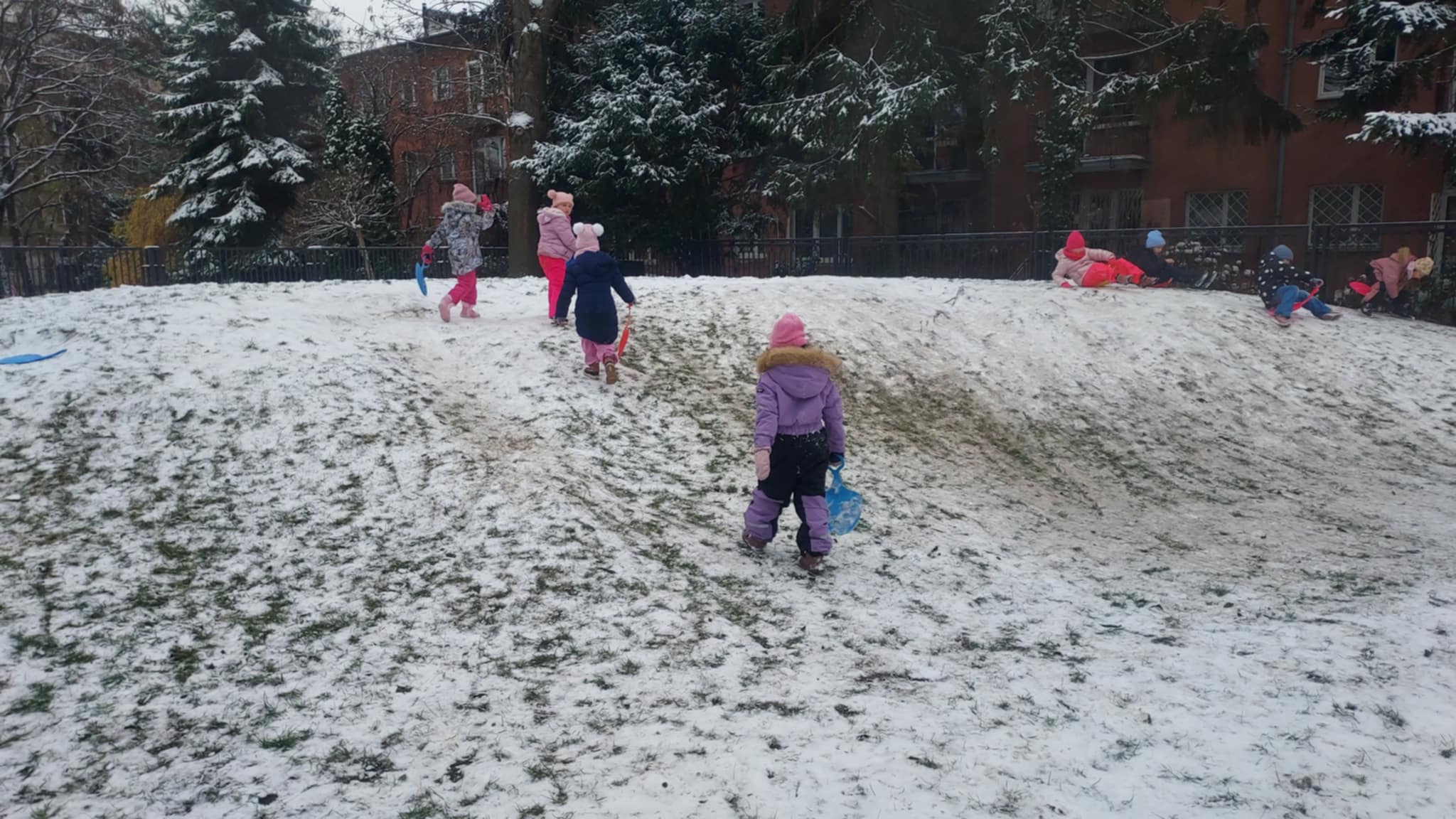 Pierwszy śnieg!!! Taka ogromna radość! Korzystamy z każdej okazji. Zjeżdżamy na jabłuszkach, robimy śnieżki, aniołki. Cieszymy się wspólną zabawą.